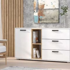 Комод имеет 3 выдвижных ящика, отделение с полкой за распашной дверцей, открытые ниши. Функциональный комод может служить подставкой под декор, косметику и местом хранения разнообразных вещей.